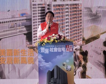 內政部長林右昌19日出席「新北市中和區警消社會住宅」上梁典禮。林右昌表示,為照顧離鄉基層警消,蔡總統特別指示內政部規劃興建全國首座警消社會住宅,總計317戶將於114年3月完工,提供給在雙北生活圈有租屋需求的基層警消及眷屬入住,實質減輕其居住負擔,政府也會持續以行動照顧警消,做他們最堅強後盾,讓他們無後顧之憂,安心執法,守護全民安全。