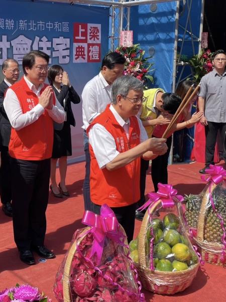 今日上梁典禮出席貴賓,包含行政院長陳建仁、內政部長林右昌、內政部次長暨國家住都中心代理董事長花敬群、警政署長黃明昭、消防署長蕭煥章、國土管理署長吳欣修、立委江永昌、新北市議員張嘉玲、新北市長副市長朱惕之、新北市中和區長楊薏霖、秀士里長洪易松、秀明里長施義男、景平里長游一龍、喻台生及戴嘉惠建築師,與地方民意代表等共同參與。