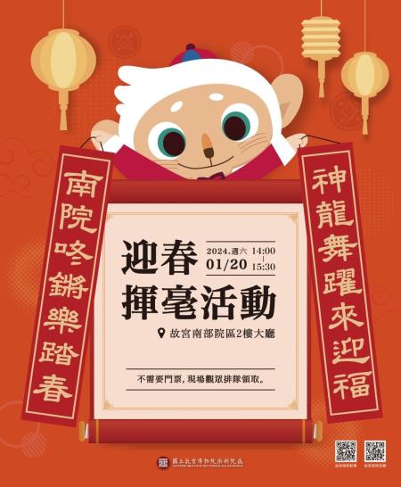 故宮南院1月20日下午舉辦「神龍舞躍來迎福,南院咚鏘樂踏春」迎春揮毫活動,邀請故宮余佩瑾副院長、書法家蕭吉川、吳輝鵬、余碧珠、施永華及曹淑蕊於博物館2樓大廳現場揮毫,歡迎觀眾前來領取好運春聯(數量有限,贈完為止)。故宮北院2月4日上午於B1大廳,舉辦「甲辰故宮喜迎春」揮毫活動,現場免費贈送春聯斗方(數量有限,贈完為止),歡迎民眾提前感受熱鬧的年節氣氛,歡喜迎接祥龍年。