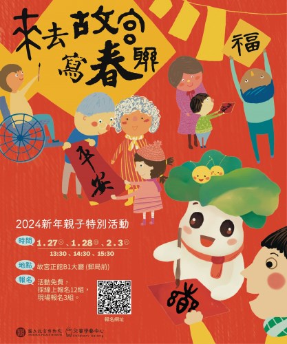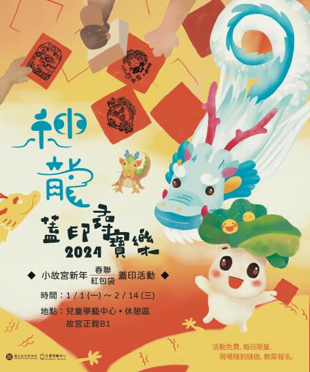 故宮北院即日起推出「神龍蓋印尋寶樂—小故宮新年春聯紅包袋蓋印」活動,2月14日前民眾可至B1兒藝中心免費索取春聯/紅包袋,蓋上結合故宮典藏龍紋圖像的吉祥印章,把福氣滿滿的春聯/紅包袋帶回家。另1月27日、1月28日、2月3日於北院B1大廳,熱鬧舉辦「來去故宮寫春聯」親子揮毫活動,每日3場,每場30人,1月19日上午10時開放線上報名,歡迎大小朋友一起揮毫寫春聯。