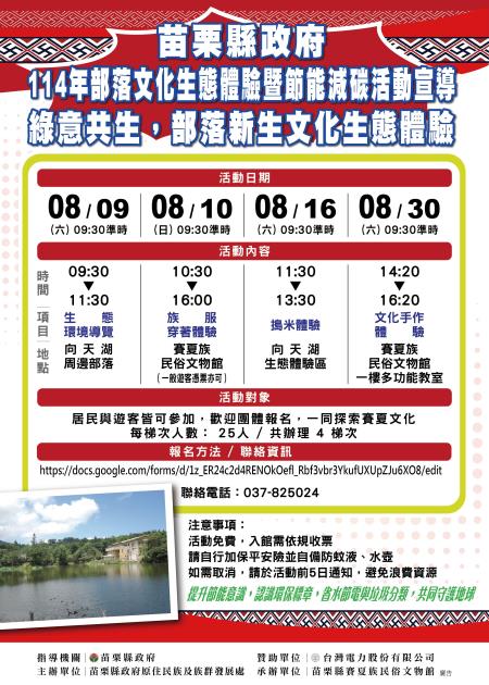 苗栗縣賽夏族民俗文物館於114年8月9日至8月30日舉辦體驗課程,邀請民眾一同體驗賽夏文化樂趣!