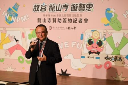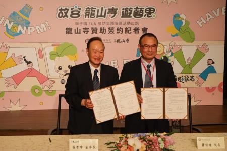 4日國立故宮博物院舉行「故宮x龍山寺遊藝思—學子嗨FUN參訪北部院區」記者會,由故宮蕭宗煌院長與台北龍山寺黃書瑋董事長代表簽約,宣布台北市艋舺龍山寺與故宮博物院再度攜手合作,特別贊助新臺幣壹佰萬元,提供全國高中職以下偏鄉、離島學生,免費參訪故宮北院及龍山寺所需交通、住宿及保險等費用,是項活動將於7月10日正式起跑,第一階段優先提供偏鄉、花東及離島學校申請報名。