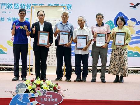 客發中心頒發感謝狀給美濃在地的書法家宋雯賢、歷任六堆運動會執行長曾耀群、佳冬蕭屋蕭義雄、佳冬楊氏宗祠楊景謀、新埤建功鍾屋夥房鍾展雄及台糖公司屏東區處。延續去(112)年國際博物館日六堆園區以「六堆生態博物館庄頭共作共伴同盟」概念,感謝長期以來對六堆客庄無私奉獻的在地居民及企業,共同編織在地的故事及永續推廣客家的文化,這些人與六堆園區是工作夥伴的關係,同時也是為六堆挹注新的力量。