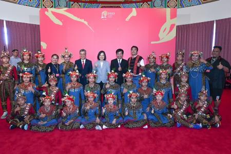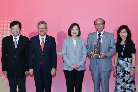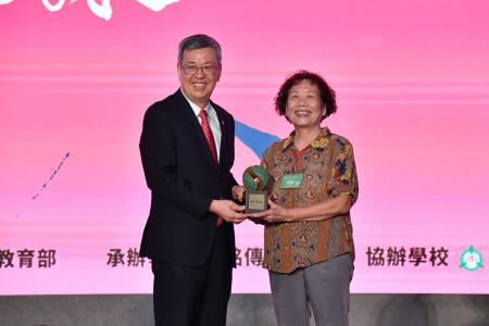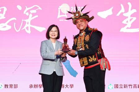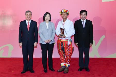 此行,陳院長陪同蔡總統到場後,首先欣賞屏東縣青葉國小魯凱歌謠兒童合唱團帶來原住民歌謠表演,院長並於致詞後親自頒發「教育奉獻獎」獎座予18位受獎者;隨後,院長與教育部潘文忠部長也陪同蔡總統分別與「教育奉獻獎」、「資深優良教師」及「師鐸獎」得主及其寶眷合影留念。