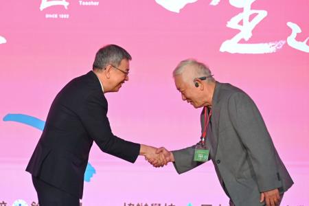 陳院長進一步表示,今年教育奉獻獎共有20位得獎者,他們一生以當教師為榮,在教育界退休後仍持續投身教學與輔導的志願服務工作,真的很了不起。其中一位得獎者國立新竹高中的謝迺岳老師,不斷嘗試用隨手可得的材料及工具,研發創意實作教具,至今已累積約2,000種科學實作教案。在COVID-19疫情期間更自主製作約200集「科學五分鐘」短片,持續為大眾解說科學奧祕,令人欽佩。