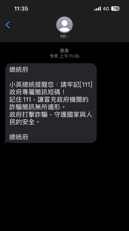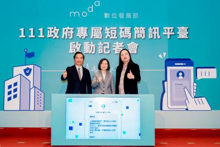 數位發展部24日上午舉行「111政府專屬短碼簡訊平臺啟動記者會」,蔡英文總統親自蒞臨,宣布啟動111簡訊平臺,並在現場示範發送111政府簡訊給參加的媒體朋友,即時展現簡訊發送功能,透過數位部推動數位信任科技的概念,宣示政府從源頭提供可信任的訊息,強化防阻詐騙。數位部唐鳳部長提醒,民眾未來只要認明111短碼,即可確認簡訊內容來自政府機關,避免被詐騙集團偽冒的政府簡訊所騙。