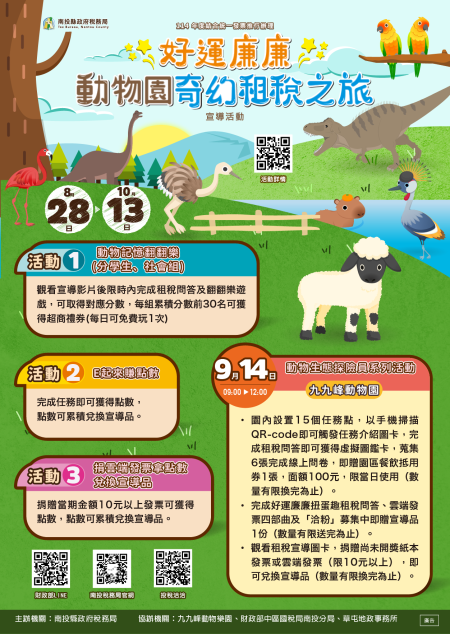 2、動物生態探險員:園內設置15個任務點,使用手機掃描QR-code以觸發動物圖卡,完成租稅問答即可獲得圖卡1張,蒐集6張並完成線上問卷,即贈園區餐飲抵用券(面額100元,限當日使用)1份,數量有限贈完為止。