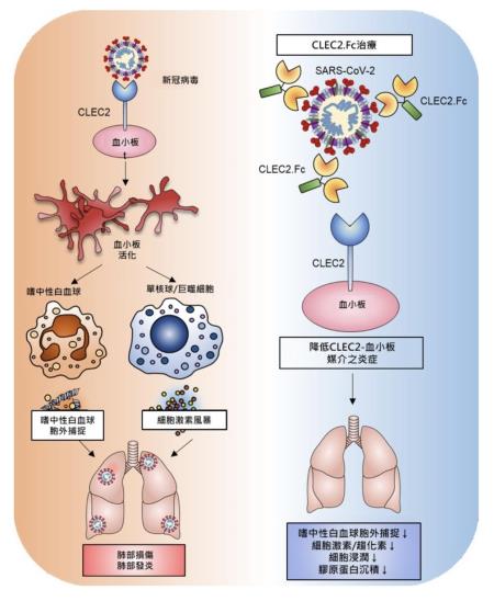 CLEC2是在血小板以及肺泡巨噬細胞上大量表現的一種受體,在過去的研究中發現CLEC2與不同病原結合,會活化血小板產生NETs,在不同器官造成微凝塊,進而引發過度發炎反應,與登革熱、腫瘤轉移的機制都有關。研究團隊發現,CLEC2與新冠病毒結合產生的聚集型NETs與以往呈現網狀結構的典型NETs不同,且在缺乏CLEC2血小板的存在下,新冠病毒無法引起NETs。研究團隊進一步利用表現新冠病毒RBD的慢病毒(lentivirus)刺激血小板以及嗜中性白血球,證實新冠病毒是經由RBD與CLEC2結合後活化血小板進而增加NETs產生。