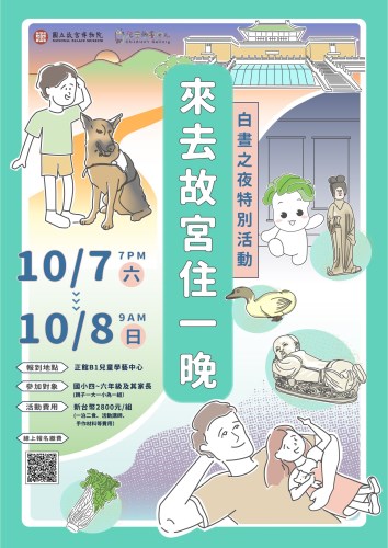 10月國慶連假期間,故宮北院響應「2023臺北白晝之夜」,10月7日週六17:00-21:00開放免費參觀,晚間18:30有明華園子團「風神寶寶兒童劇團」演出的精湛戲劇《我的風神寶寶與風神寶寶》。另首度推出「來去故宮住一晚」親子夜宿活動,包含明星文物捏塑DIY、晚間點心、夜探國寶、夜宿故宮、士林在地早餐與警犬日巡故宮等,活動今日開放報名隨即秒殺,引起粉絲熱烈迴響。更多白晝之夜的精彩活動,歡迎民眾關注故宮官網及粉絲專頁最新消息。