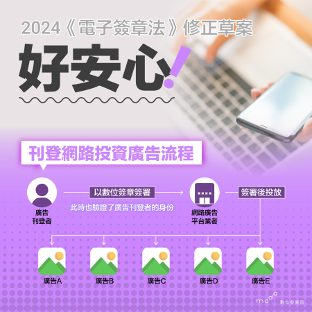 本次修法除了將促進數位經濟及智慧政府發展,數位部更積極與經濟部研議新增「無實體網路廣告」營業項目,並由數位部主管,未來將推動投資廣告刊登前先驗證數位簽章(電子簽章的一種),預期可有效減少投資詐騙與人頭廣告帳號,打造可信任的數位環境。