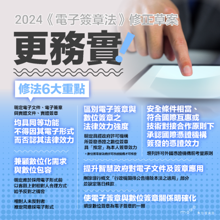 數位發展部表示,現行「電子簽章法」實施以來已逾20年未修正,為因應全球數位轉型趨勢、數位經濟與數位服務快速發展,本部提出「電子簽章法」修正草案,明定電子文件及電子簽章的功能等同實體文件及簽章,確認電子簽章的法律效力。草案經行政院會於今(29)日通過,並函請立法院審議。