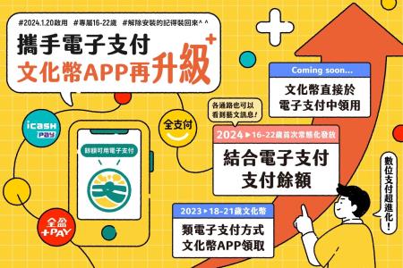 今年首次常態化擴大發給16-22歲青年的文化成年禮金,將於1月20日正式上路。文化部今(10)日宣布,將攜手全支付、全盈+PAY、icash Pay等3家具有實體店面的電子支付共同合作,文化幣APP再升級,文化幣支付不足餘額可以3家電子支付付款,為青年打造更便利的藝文消費體驗;同時即日起3家零售通路也將回饋藝文訊息露出機會,方便所有民眾獲取藝文資訊,全面提升藝文產業能量。