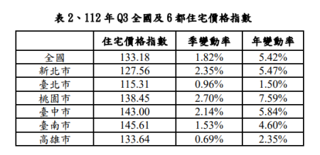 內政部15日發布112年第3季住宅價格指數,本季全國住宅價格指數為133.18,相較上季上漲1.82%,較111年同季上漲5.42%。內政部表示,本季指數維持上漲趨勢,但從年變動率趨勢觀察,本季年增5.42%,較上季年增5.51%微降,全國住宅價格指數年增率自111年第2季高點10.27%,已連續5季下修,顯示房市漲勢持續趨緩。