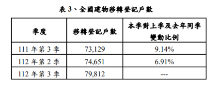 本季全國建物買賣移轉登記棟數為7萬9,812戶,較上季7萬4,651戶,增加6.91%,較111年同季7萬3,129戶,增加9.14%;而住宅價格指數僅季增1.82%,顯見本季全國房市呈現量價微增情形。