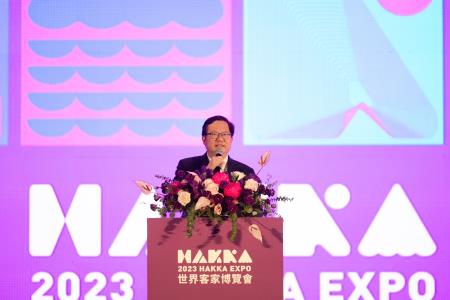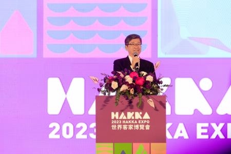 鄭副院長致詞時除了肯定客家博覽會展現臺灣多元文化的包容及豐富的一面,也提到其連結在地與全球、結合文化與科技的特色,更肯定臺灣自1988年還我母語運動後,各式客家文化的振興,讓客家逐漸走向主流化。期許政府與民間能共同重視客家,讓客家成為向世界推展的文化名片。