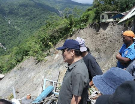 原住民族委員會主任委員曾智勇Ljaucu·Zingrur13日親赴丹娜絲颱風及七二八豪雨造成嚴重災情的屏東縣三地門鄉,現勘受災情形與輔導復原重建工作,盼中央與地方攜手合作,加速完成各項復建工作。