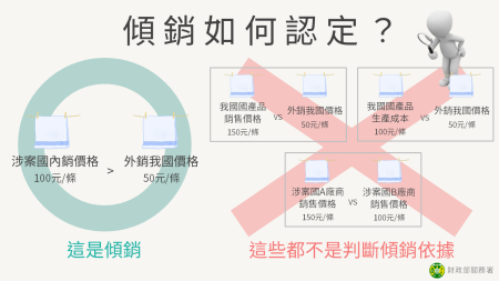 關務署說明,判斷進口貨物有無傾銷事實,係根據涉案貨物在該國實際內銷價格與外銷我國價格自為比較,就個別製造商或出口商認定傾銷差率;並非與我國國產品生產成本或與其他涉案廠商間產品價格進行比較,亦非商品出口價格較我國國產品低即為傾銷。