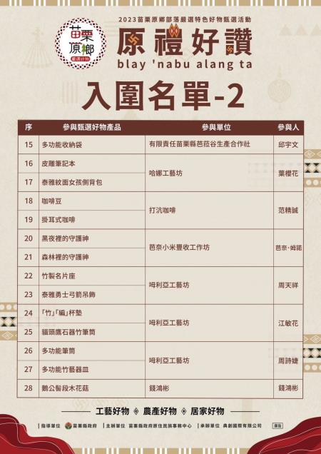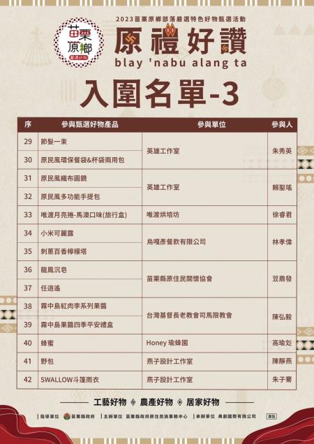 苗栗縣政府感謝苗栗縣內族人踴躍報名參與本次「原禮.好讚」2023苗栗原鄉部落嚴選特色好物甄選活動,經第一階段初審資格審查後,共有42件特色好物入圍,公告名單如附件圖檔所示。