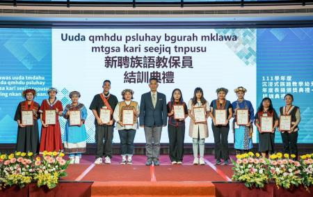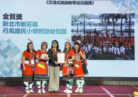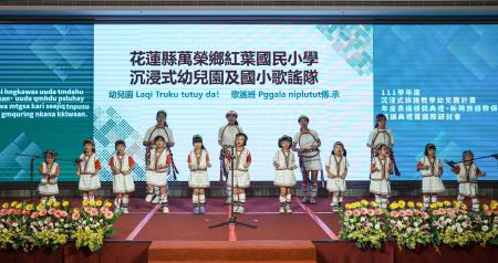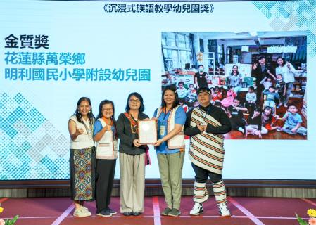 原民會21日於花蓮美侖大飯店辦理「111學年度沉浸式族語教學幼兒園計畫-年度表揚頒獎典禮、成果發表會、新聘族語教保員結訓典禮」,由王美蘋Akiku·Haisum主任秘書頒發8個獎項,表彰幼兒園所傳承族語的努力,同時向全國各園所介紹今年新進11名族語教保員,期待生力軍的加入讓族語在更多幼兒園所扎根,現場有170人參加。