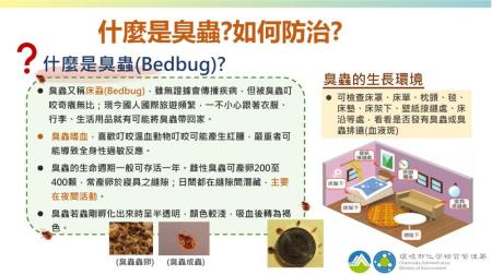 根據報導,近來許多國家遭受「臭蟲」的侵擾,由於國際旅遊往返頻繁,提醒民眾自國外回來後,立即清洗衣服及檢查行李,避免攜帶臭蟲回家。若發現臭蟲,也別驚慌,勤檢查衣服行李家俱細縫,運用「曝曬、熱蒸、勤捉、清洗」清除臭蟲四妙招,最後手段才使用環境用藥殺蟲劑。