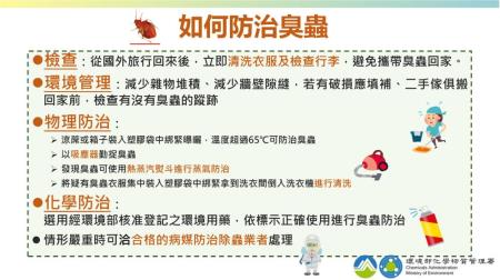 環境部表示,民眾從國外旅行回來後,立即清洗衣服和檢查行李,有無夾帶臭蟲,另外二手家具搬回家前,檢查有沒有臭蟲的蹤跡,在家裡也要勤於清理環境,減少雜物堆積、減少牆壁隙縫,並檢查床罩、床單、枕頭、毯、床墊的線縫等處,看看是否發現有臭蟲或臭蟲排遺(血液斑)。以檢查清理、物理防治為優先,化學防治為輔,小範圍以物理防治處理,大範圍再考慮化學防治。