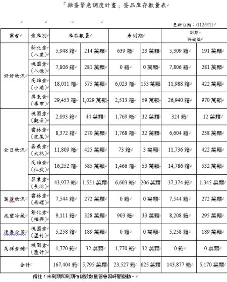 農業部強調,所有到期雞蛋均依規定,分倉、分行儲放於各冷鏈物流倉庫(如附表),除完整標示「報廢品待銷毀」並依規定整板包膜,另倉儲管理單位也針對廢品儲位同步做出貨系統鎖單控管,沒有流入國內市場的風險。
