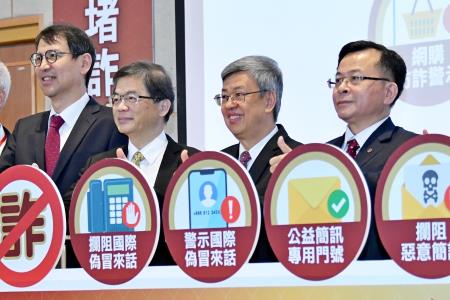 在組織面部分,陳院長指出,除了臺灣高等檢察署成立「查緝詐欺及資通犯罪督導中心」,專責打擊電信網路詐欺犯罪外,「行政院打擊詐欺辦公室」也已揭牌運作,負責統合各部會力量;另外,內政部警政署及法務部調查局也分別成立北、中、南打詐工作站與防制中心,強化科技偵蒐設備及懲詐執法量能。在技術面部分,政府從源頭控管,自今年1月迄今,已攔阻境外詐騙電話超過1,100萬通、詐騙簡訊393萬則,並已建置「電商資安與詐騙網址通報機制」,加速下架涉詐廣告。