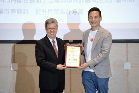 陳院長到場後,先手持打詐手板與貴賓大合照,隨後觀賞打詐堵詐執行成效短片;致詞結束後,院長頒贈感謝狀予5位得獎業者代表,並與貴賓一同持打擊槌,敲下詐騙立牌,喊出口號「打擊詐欺 強化堵詐」,完成堵詐1.5版宣言儀式。