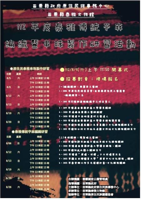 苗栗縣泰雅文物館自112年8月5日起至8月26日止,每週六、日上午10時至12時及下午1時至3時,於泰雅文物館辦理泰雅傳統「苧麻編織研習」課程,以及「泰雅之戀-串珠研習」課程。開幕式於112年8月5日上午11時隆重開場。希望透過傳統工藝技術教學,重新連結泰雅族群工藝與其背後代表的文化意義,藉此尋復凋零或瀕臨失傳的在地知識與物質文化,使族人實踐文化詮釋之權利。