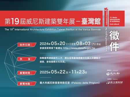 為鼓勵優秀建築創作人才,提出呈現臺灣建築文化與人文觀點之提案,以及參與國際文化交流,由文化部指導、國立臺灣美術館主辦2025年「第19屆威尼斯建築雙年展﹣臺灣館」將於今(2024)年5月20日起至8月3日止對外公開徵選「臺灣館」參展提案。「第19屆威尼斯建築雙年展--臺灣館」徵選案,主辦單位仍承續歷屆精神並秉持開放態度,鼓勵優秀建築人才追求突破與創新,提出能與當代世界對話、分享,且具啟發性、挑戰性觀點,並足以完整呈現於臺灣館內之參展提案,並從中徵選出最優秀之作品代表我國參加「第19屆威尼斯建築雙年展」。