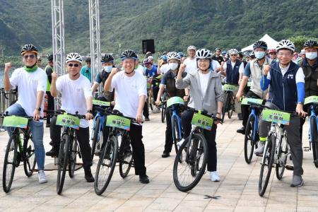 陳院長進一步表示,今日全國50條路線的騎士也會同步全臺環騎,屆時透過上傳騎乘軌跡至APP應用程式,將能看到騎乘軌跡訊號環繞美麗臺灣島的景象,並祝福大家今日能有一趟美好的鐵馬之旅,在騎乘過程中,除了發掘臺灣之美,也為環保減碳盡一份心力。