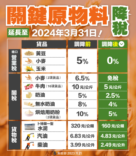 財政部表示,因應俄烏戰爭情勢,為確保國內物資充裕,穩定物價,業依貨物稅條例第7條與第10條及關稅法第71條規定,報奉行政院核定,自113年1月1日起至同年3月31日止,繼續機動調降汽油、柴油與卜特蘭一型水泥3項貨物稅應徵稅額,汽油由每公升徵收新臺幣(下同)6.83元調降至4.83元,降幅29.3%,柴油由每公升徵收3.99元調降至2.49元,降幅37.6%,卜特蘭一型水泥由每公噸320元調降至160元,降幅50%;繼續機動調降牛肉、奶粉、奶油及小麥等22項關稅稅率,牛肉由每公斤10元調降至5元、烘焙用奶粉由10%調降至5%、奶油由5%調降至2.5%、無水奶油由8%調降至4%,降幅均為50%,另小麥由6.5%調降至免稅,降幅100%。