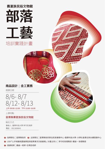 為提升苗栗縣工藝藝術家,如何加強商品設計、打造文創品牌以及行銷的能力,苗栗縣賽夏族民俗文物館首次與龍華科大合作,以USR部落工藝教室實踐計畫共同開辦「商品設計與金工研習課程」,課程時間為112年8月6日起至8月7日,以及8月12日起至8月13日止,上午9時至12時及下午1時至4時,藉此課程培育更多的工藝藝術家,如何從自身的才藝與設計的理念,進而開創屬於自己的品牌,也行銷我文化的創意商品。