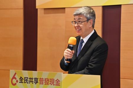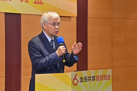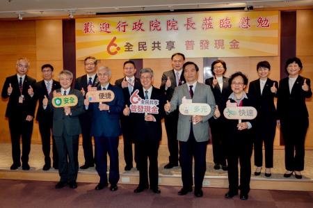 陳院長抵達後,首先聽取財金公司林國良董事長簡報「全民共享普發現金專案辦理情形 」,並於致詞結束後致贈慰勉金,由林董事長代表受領;隨後,陳院長手持「全民共享普發現金」手板,與現場貴賓及該公司同仁一起比讚合影留念,場面熱絡。