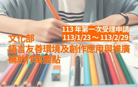 文化部為振興瀕臨失傳的語言文化,持續辦理「語言友善環境及創作應用與推廣補助作業要點」,上半年度收件期間自即日起至113年2月29日止。今年特別增加資源調整每案最高補助金額為新臺幣100萬元,期盼在各國家語言的復振上,尋找生力軍,注入新的活力與創意,讓語言文化得以蓬勃發展。