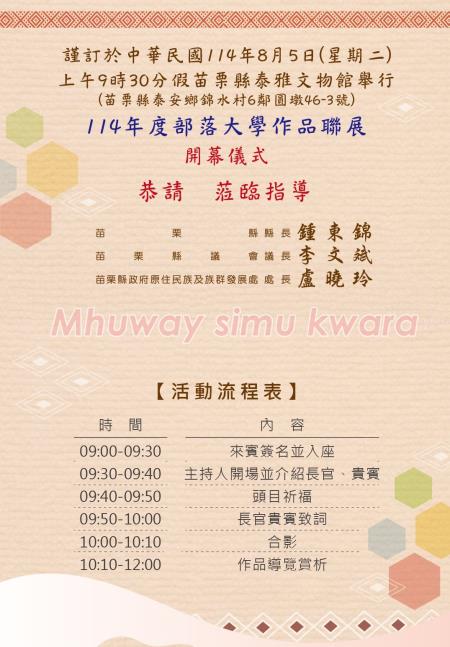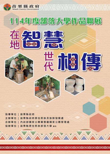 苗栗縣泰雅文物館於114年8月5日起至11月5日止,舉辦原住民部落大學作品聯展,以「在地智慧.世代相傳」為主題,吸引眾多民眾及貴賓共襄盛舉。