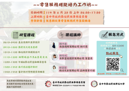 四、課程內容:產品及陳列美學設計、原民文化元素應用、攤位設計與擺設技巧、攤商相關精進作為及審計新村實際觀摩與輔導。