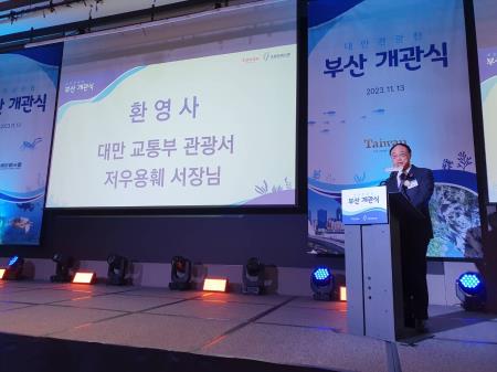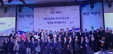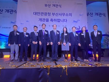 交通部觀光署周永暉署長親自主持釜山辦事處揭牌儀式,隨即於市中心全新開幕的溫德姆飯店Wyndham Grand Hotel舉行開幕酒會,包括駐韓國臺北代表部釜山辦事處郭承凱處長、釜山廣域市觀光協會李泰燮會長、大邱廣域市觀光協會李韓洙會長、韓國觀光公社釜山蔚山支社朴喆浩選任次長、韓國國際郵輪研究所林福順所長、中華航空釜山分公司陳威傑總經理、桃園航勤股份有限公司林祥生董事長、中華顧問工程司葉文健副執行長等貴賓蒞臨,以及韓國當地的旅遊業者、航空公司及媒體共同見證,現場並由華僑中學舞獅隊進行開幕表演,熱鬧非凡。