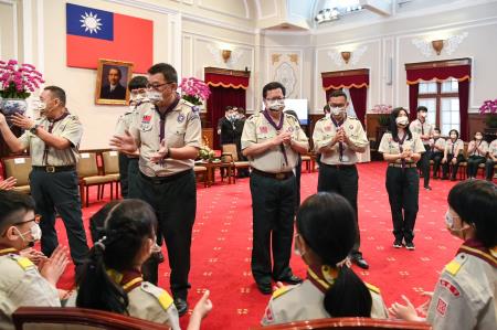 鄭副院長強調,童軍總會已取得承辦2025年亞太地區童軍領袖會議的資格,屆時如成功爭取到在臺舉辦2029年世界羅浮大會,相信透過一連串的國際活動,將有助於增進臺灣與國際的交流,讓世界看見臺灣。最後,鄭副院長也期勉每位童軍夥伴持續努力向前走,每天以美好的態度擁抱及面對生活,具體展現童軍精神。