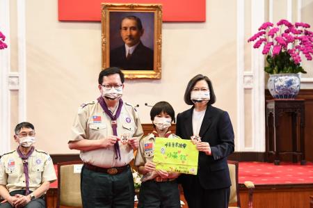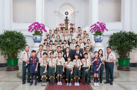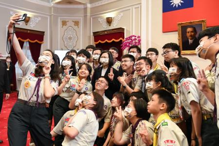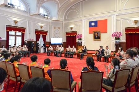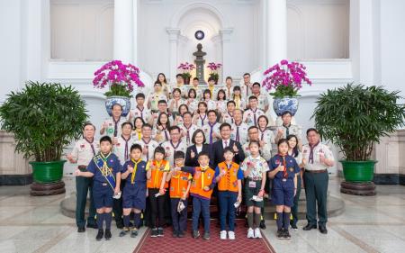 此行童軍總會代表團於蔡英文總統蒞臨會場後,起身齊唱「歡迎歌」,並與蔡總統一同欣賞童軍服務成果影片,鄭副院長也以該總會理事長身分代表接受蔡總統致贈的紀念品,並回贈童軍布章予蔡總統,現場幼童軍亦贈送蔡總統手繪創作。最後,代表團分梯次與蔡總統自拍合影,並於總統府敞廳大合影留念。