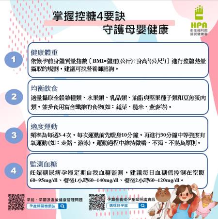 妊娠糖尿病與孕產及周產期併發症風險有關,根據國外文獻指出,患有妊娠糖尿病的孕婦罹患妊娠高血壓的風險為未罹患妊娠糖尿病孕婦的1.9倍、引產風險為1.4倍、剖腹產風險為1.3倍、早產風險為1.4倍。此外,有妊娠糖尿病孕媽咪其胎兒過大的風險為未罹患妊娠糖尿病者的1.6倍、入住新生兒加護病房的風險1.4倍。國民健康署呼籲,孕媽咪們於妊娠第24-28週時,可攜帶「孕婦健康手冊」及健保卡至產檢院所接受空腹、口服75公克葡萄糖1小時及2小時後,共3次血漿葡萄糖測定之妊娠糖尿病篩檢。另外,家族成員有糖尿病病史、高齡、肥胖、曾經發生死胎、胎兒畸型、產檢發現胎兒過大、羊水過多等症狀的孕婦,為妊娠糖尿病的高危險族群,孕期需要特別留意血糖數值及定期產檢。國民健康署也提供穩定血糖4要訣,供孕媽咪們運用: