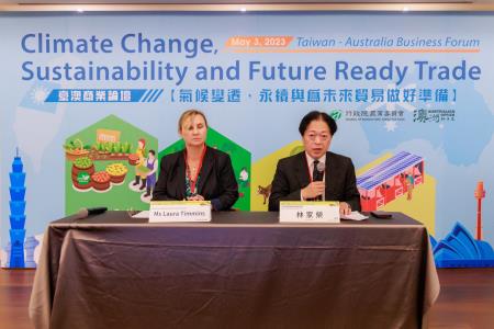 農委會與澳洲農業部3日在雲林舉辦「氣候變遷、永續與為未來貿易做好準備」臺澳農業商業論壇,實體與線上共有約150位臺灣及澳洲產官學研代表參與,共同探討「建立農業部門因應氣候變遷之能力」、「氣候變遷、永續發展與商務貿易:連結生產者公私協力案例」及「減少碳排與適應氣候變遷之農業先進技術」等主題,並針對畜產碳中和及淨零碳排技術應用、漁電共生因應氣候變遷、捕撈漁業替代燃料,以及循環利用物流籃等技術與經驗深入討論,開拓臺澳雙方在農業與食品領域發展合作的綠色商機。