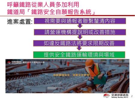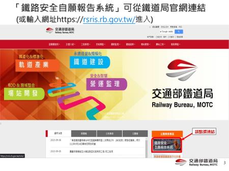 https://rsris.rb.gov.tw/,鼓勵營運機構從業人員善加利用,藉由發現不安全事項及本局之監理作為,共同為旅客提供更安全、便捷的鐵路運輸系統,並提升整體鐵路安全水準。