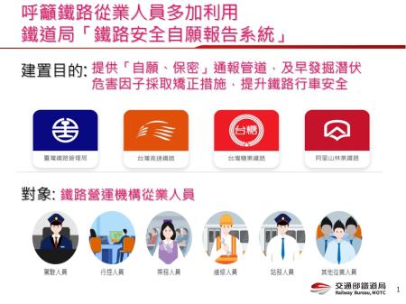為加強鐵路安全監理實務執行,交通部鐵道局依鐵路法第56-6條規定於官網建置「鐵路安全自願報告系統」,提供鐵路營運機構從業人員「自願、保密」之通報管道,將工作中所發現不安全或有安全疑慮之狀況通報鐵道局,以及早發掘潛伏在鐵路系統之危害因子,並督促營運機構適時採取必要之矯正措施,避免影響鐵路行車安全。