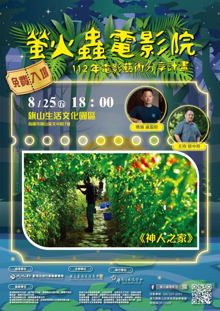 文化部所屬國立臺南生活美學館辦理「2023年螢火蟲電影院」8月25日(五)下午6時假高雄旗山生活文化園區播映由盧盈良執導優質國片《神人之家》,歡迎大家在暑假夜晚走出戶外,一起欣賞臺灣好電影,用行動支持國片。