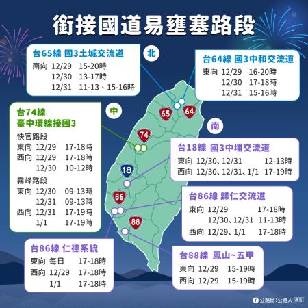 另外配合高速公路局預估11處國道易壅塞路段也已規劃替代道路,並於沿線設置導引牌面供用路人遵循行駛,建議用路人可於出發前先至「智慧化省道即時資訊服務網」(