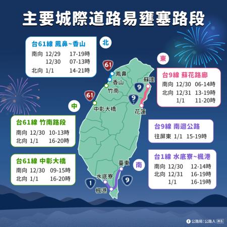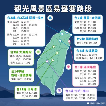 公路交通部分,預估元旦連續假期車潮將自12月29日(星期五)下午起陸續出現;觀光旅遊車潮將於12月30日(星期六)至1月1日(星期一)於各大風景旅遊熱點湧現;返回工作地車潮預計於12月31日(星期日)下午開始陸續出現。