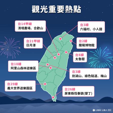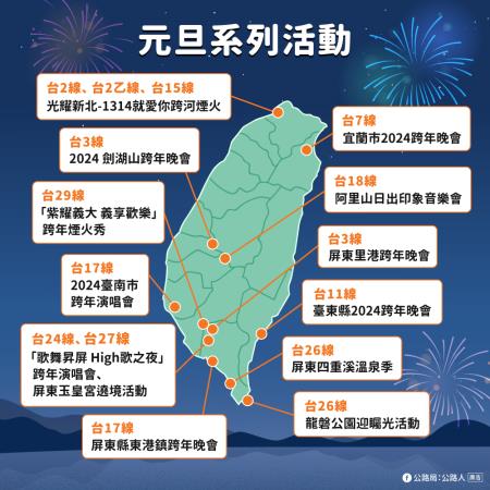 本次連假全台有多處舉辦跨年及迎曙光等活動,前往參與活動前請多留意當地路況,並請注意行車安全、避免疲勞駕駛;公路局亦針對元旦系列活動規劃相關疏運措施及公共運輸服務,歡迎多加利用。