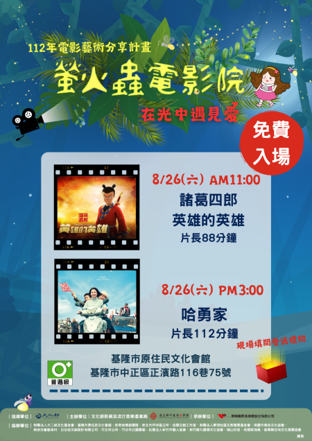 由文化部指導,文化部影視及流行音樂產業局與國立新竹生活美學館共同主辦「電影藝術分享-螢火蟲電影院」計畫,8月25、26、27日將連續三日放映電影,分別於台北市北投區新奇岩社會住宅、基隆市原住民文化會館及新北市汐止夢想社區,接力上映「諸葛四郎-英雄的英雄」、「哈勇家」及「科學少女」三部精彩國片。