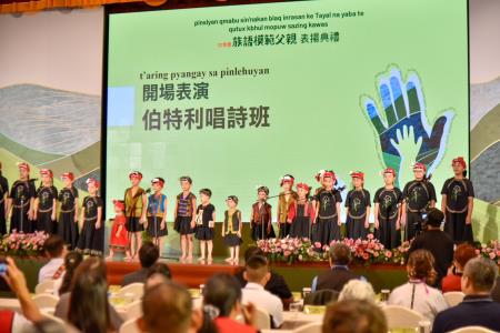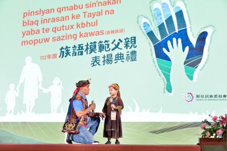 原民會8日於臺北圓山大飯店辦理112年度「族語模範父親表揚典禮」,由夷將.拔路兒Icyang‧Parod主任委員頒獎。今年共甄選出原住民族16族57位族語模範父親,其中5位特別獎得主家庭成員中,有流利族語聽力、口說能力之幼兒,展現家庭內將族語傳習給下一代的成功案例。